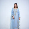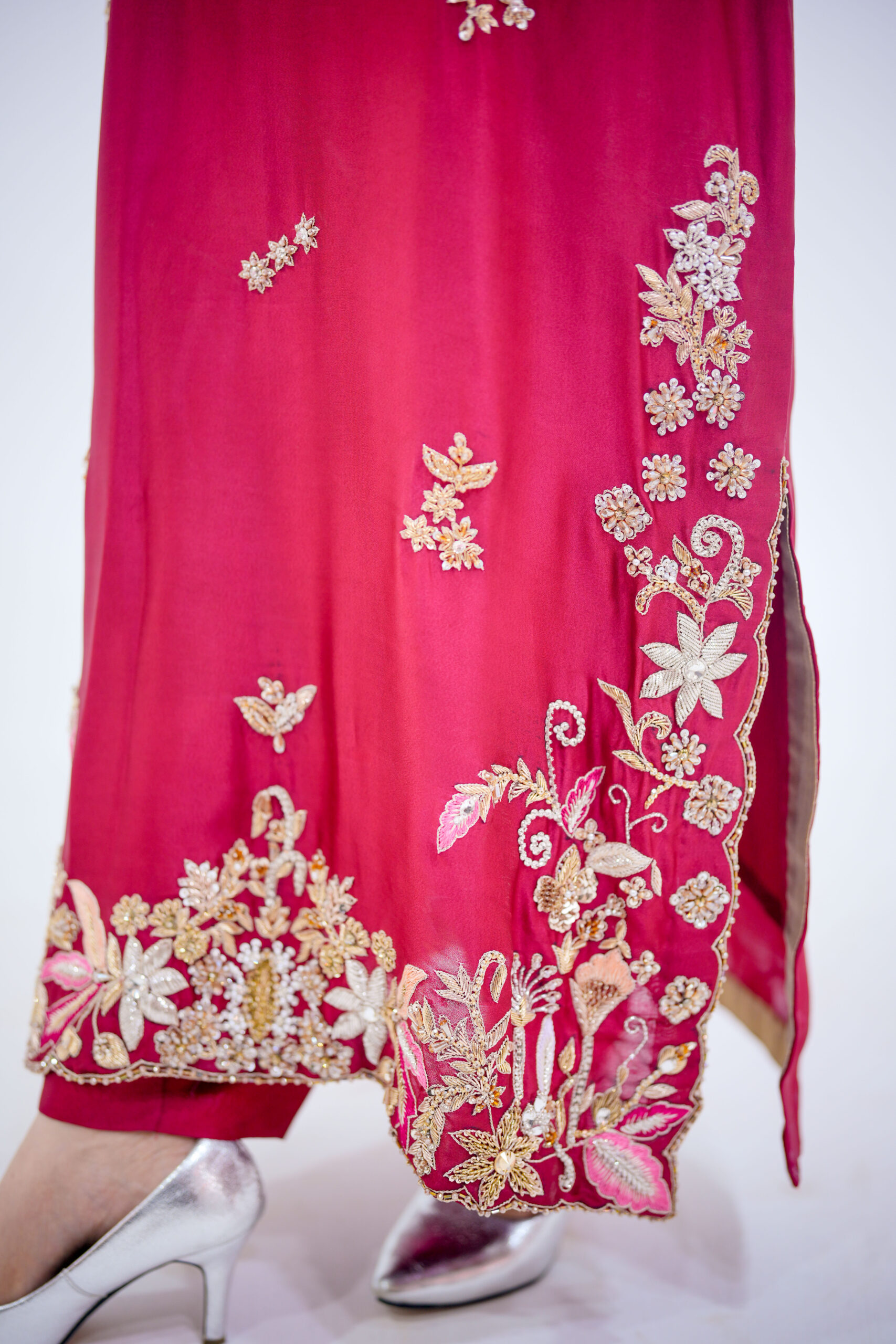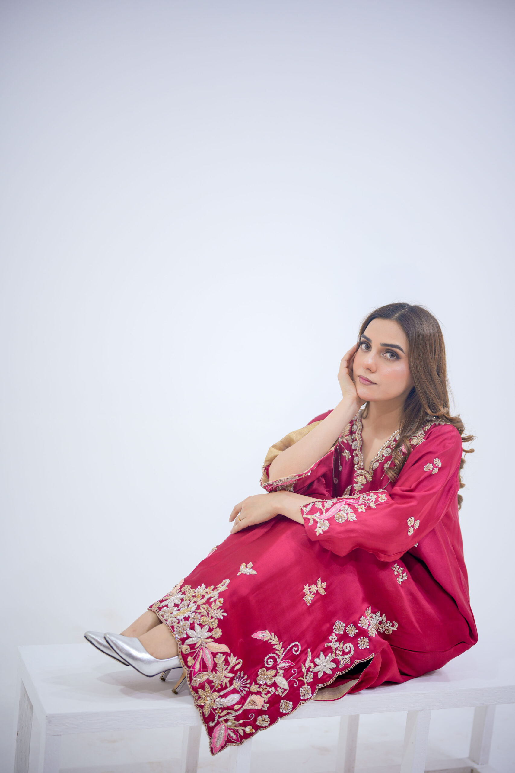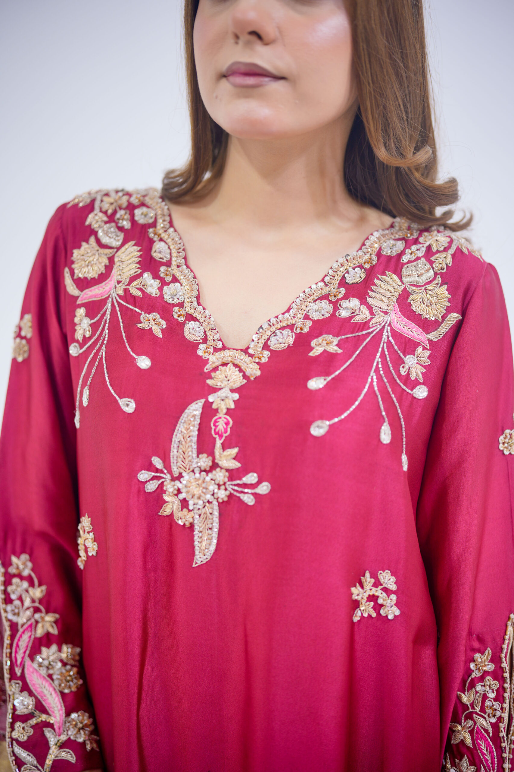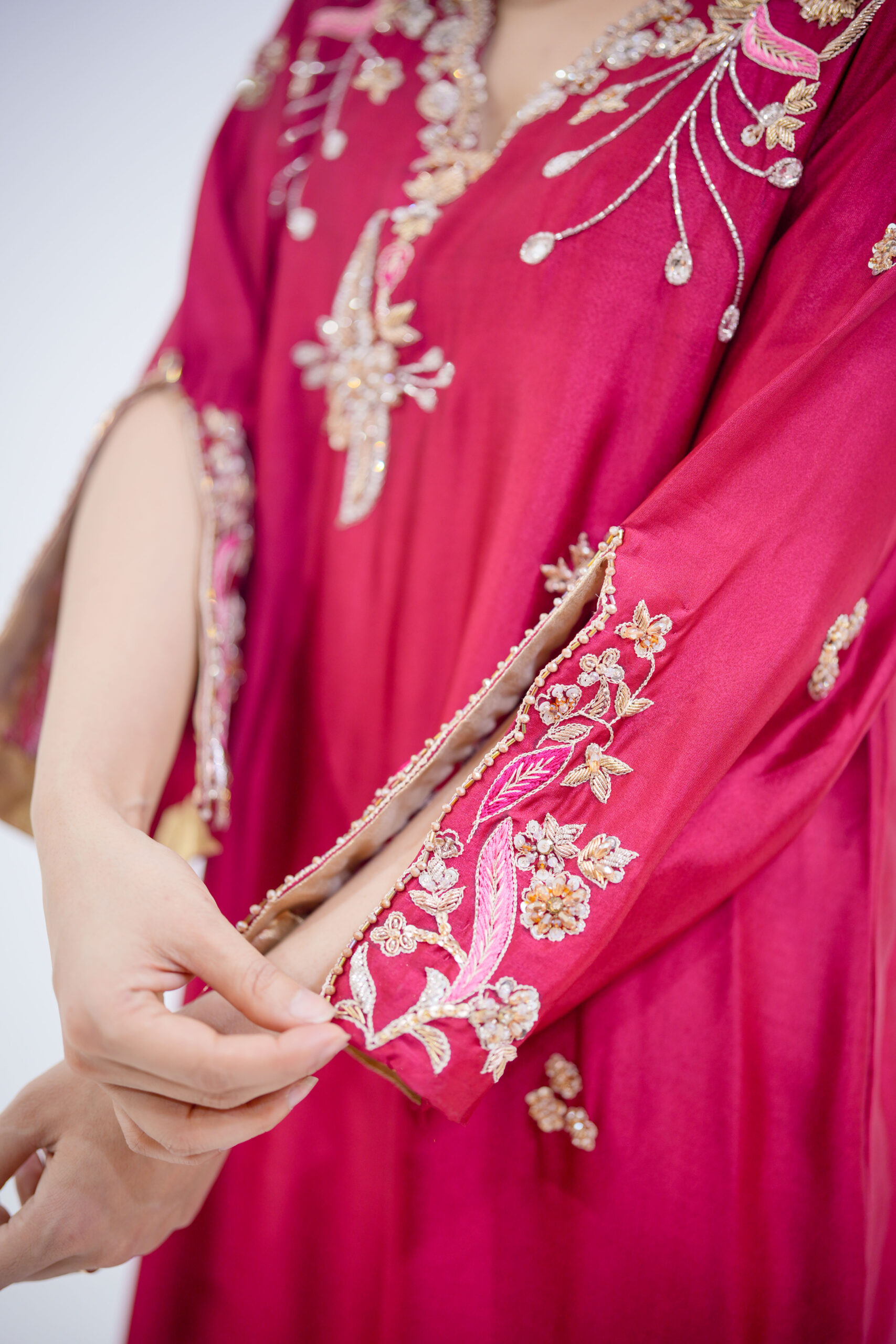 This cherry Red Tissue Silk Kaftan shirt hand embellished is a rich and regal color combination that beautifully balances cool elegance with festive vibrance. This is a flowy silhouette Rooted in Mughal-era fashion, it’s a perfect blend of classic elegance and modern glam widely worn at weddings, nikkahs, mehndis, and formal events. Paired with an Chiffon celestial-inspired piece that blends delicate craftsmanship with whimsical charm. It’s perfect for mehndi, sangeet, receptions look for someone seeking an ethereal, romantic aesthetic.