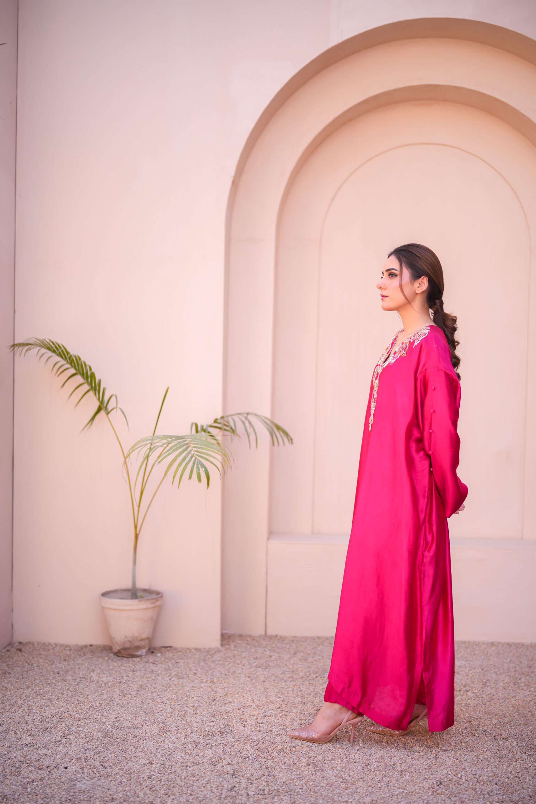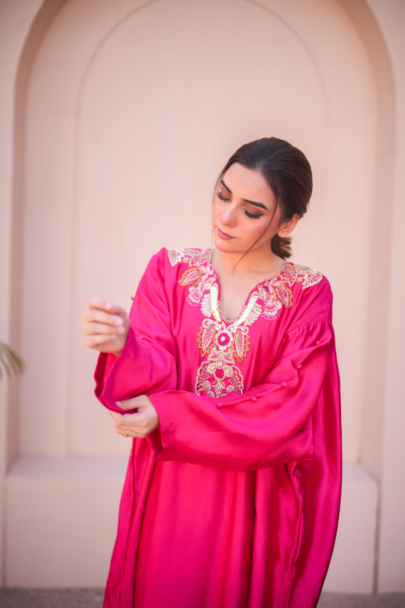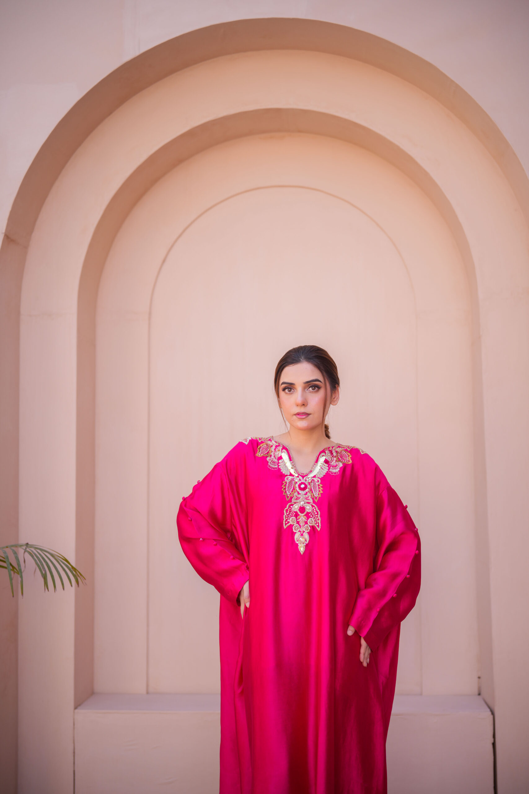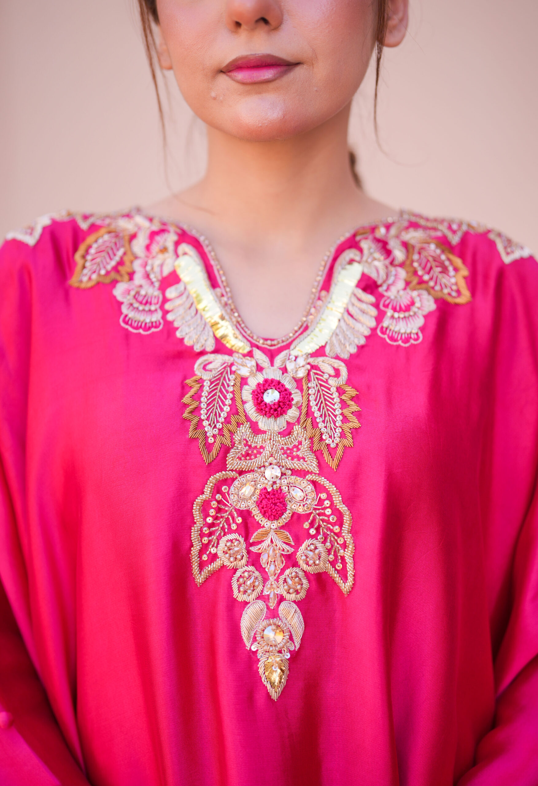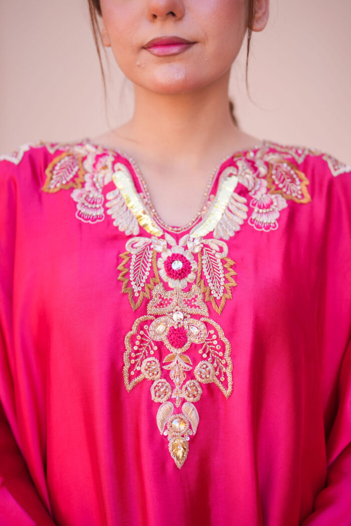 This blossoom Tissue Silk Kaftan hand embellished is a rich hand work of mukesh, Dabka, naqshi, buggle beads, crystals stones, sequins, threads and regal color combination that beautifully balances cool elegance with festive vibrance. This is a flowy silhouette Rooted in Mughal-era fashion, it’s a perfect blend of classic elegance and modern glam widely worn at weddings, nikkahs, mehndis, and formal events. Paired with an Chiffon celestial-inspired piece that blends delicate craftsmanship with whimsical charm. It’s perfect for mehndi, sangeet, receptions look for someone seeking an ethereal, romantic aesthetic.
