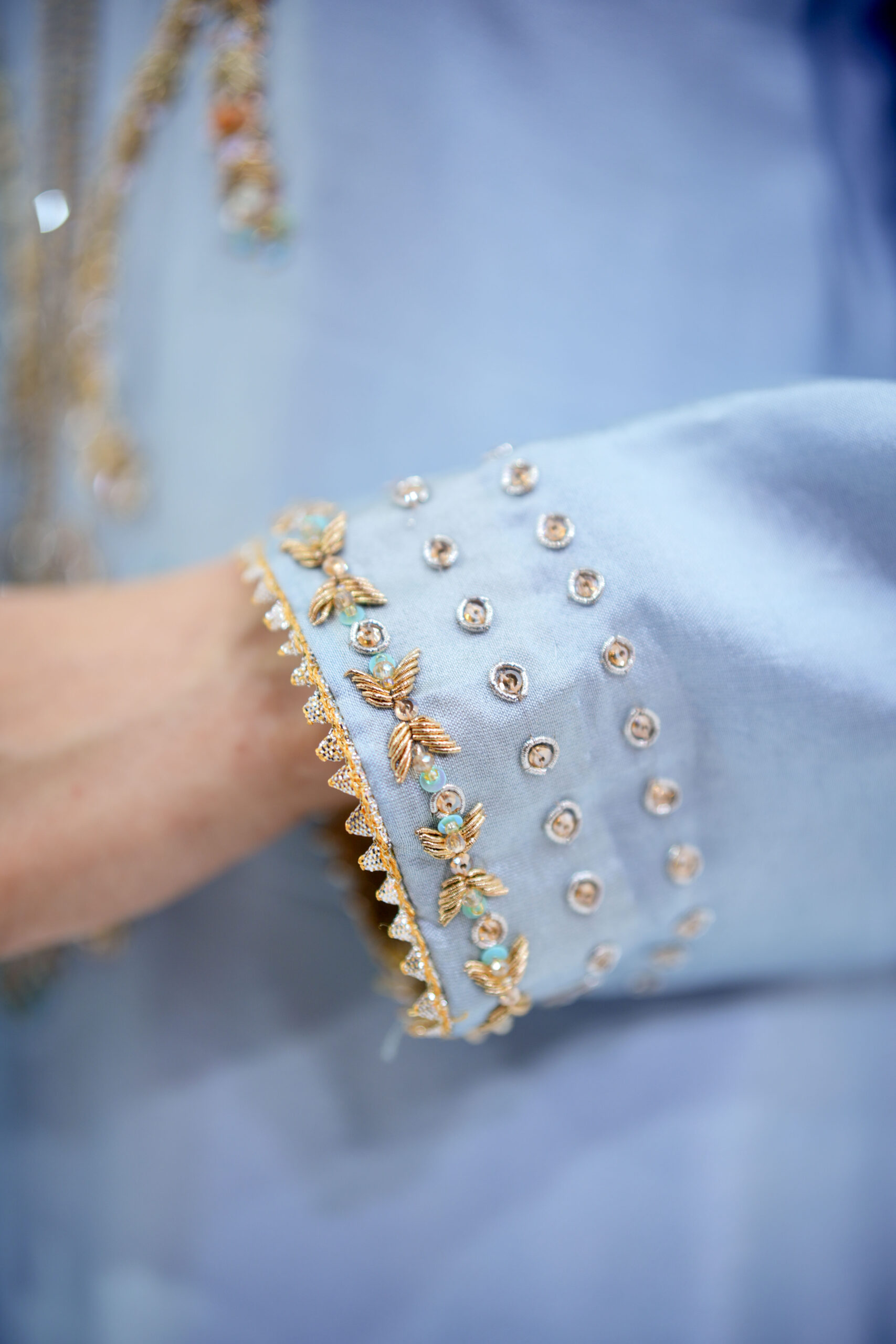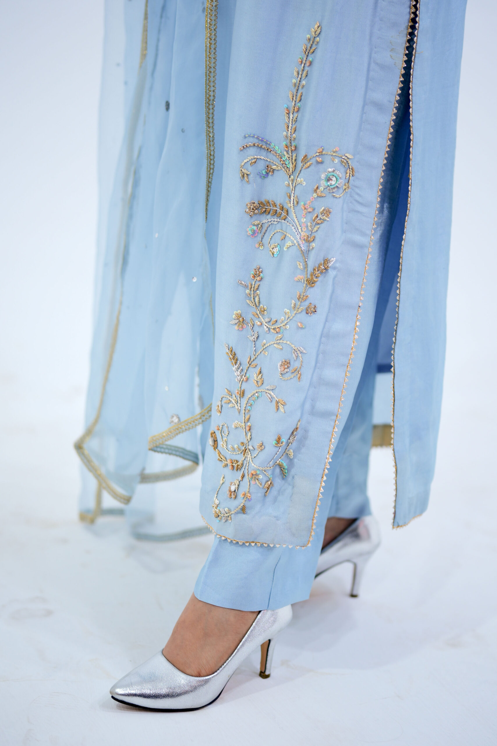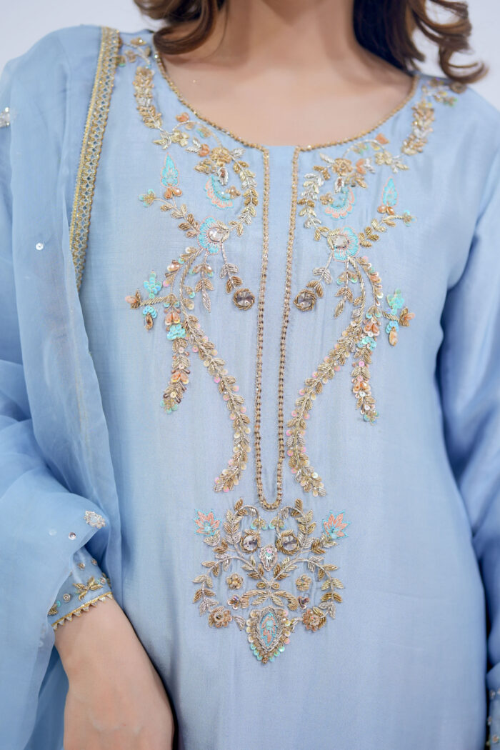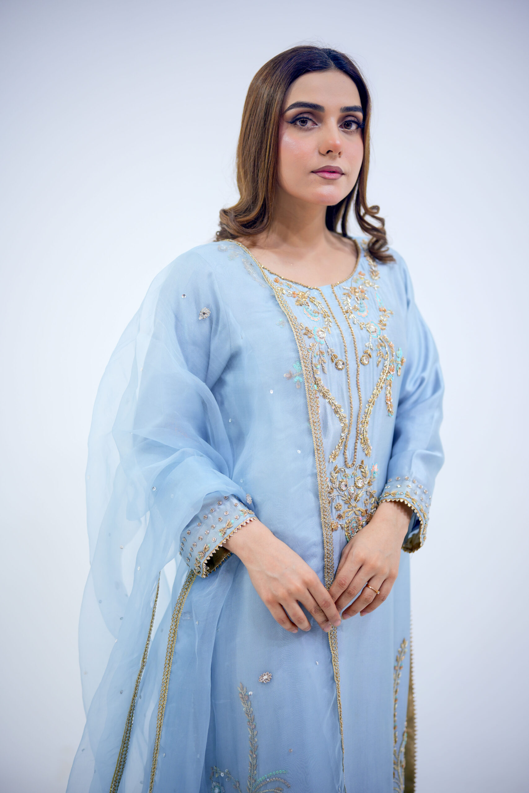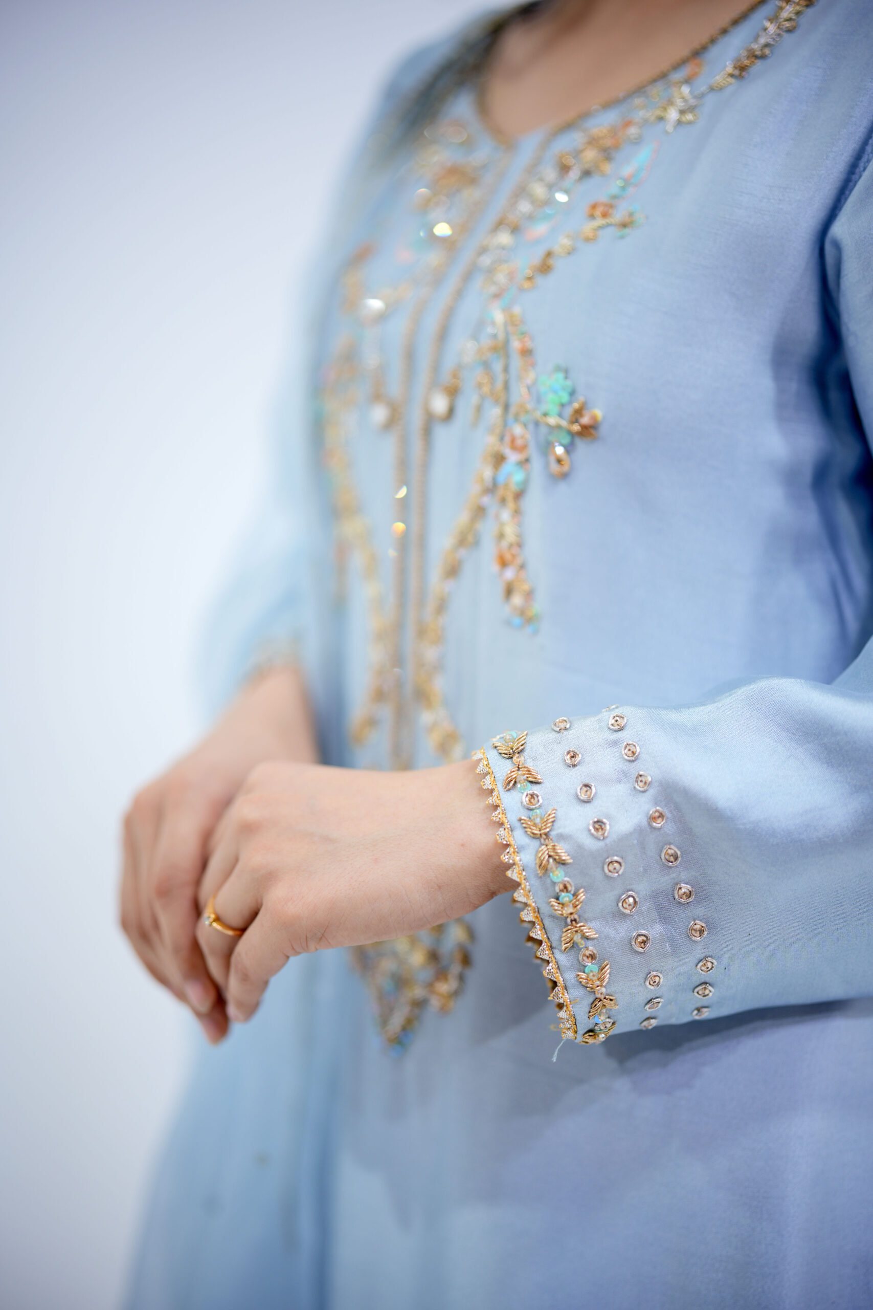 This Ice blue Tissue Silk Long shirt hand embellished is a rich and regal colors of modern era hand work techniques that beautifully balances royal elegance with festive vibrance. This is a flowy silhouette Rooted in modern era fashion, it’s a perfect blend of classic elegance and modern glam widely worn at weddings, nikkahs, and formal events. Paired with an organza celestial-inspired piece that blends delicate craftsmanship with whimsical charm. It’s perfect for Parties, receptions look for someone seeking an ethereal, romantic aesthetic.