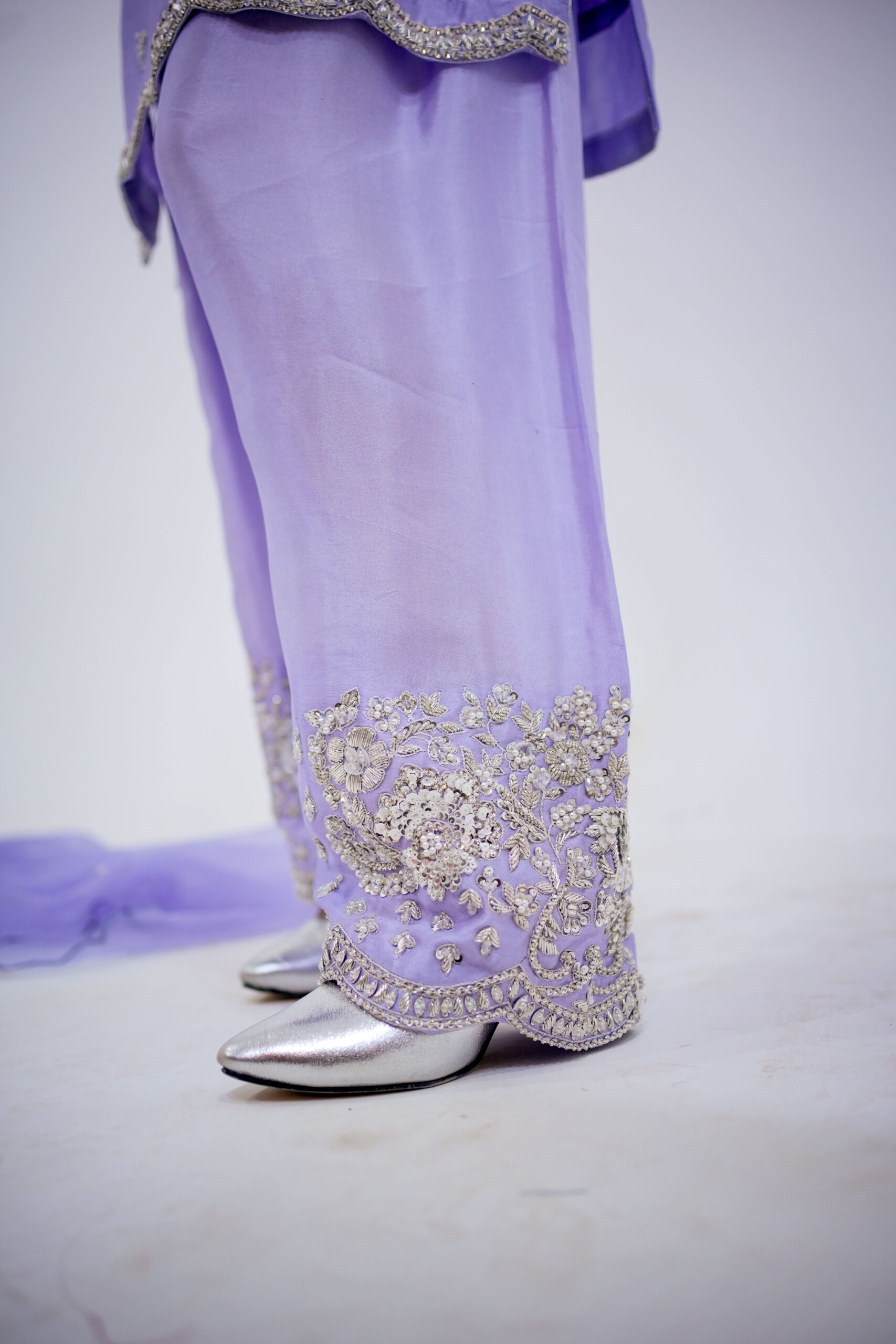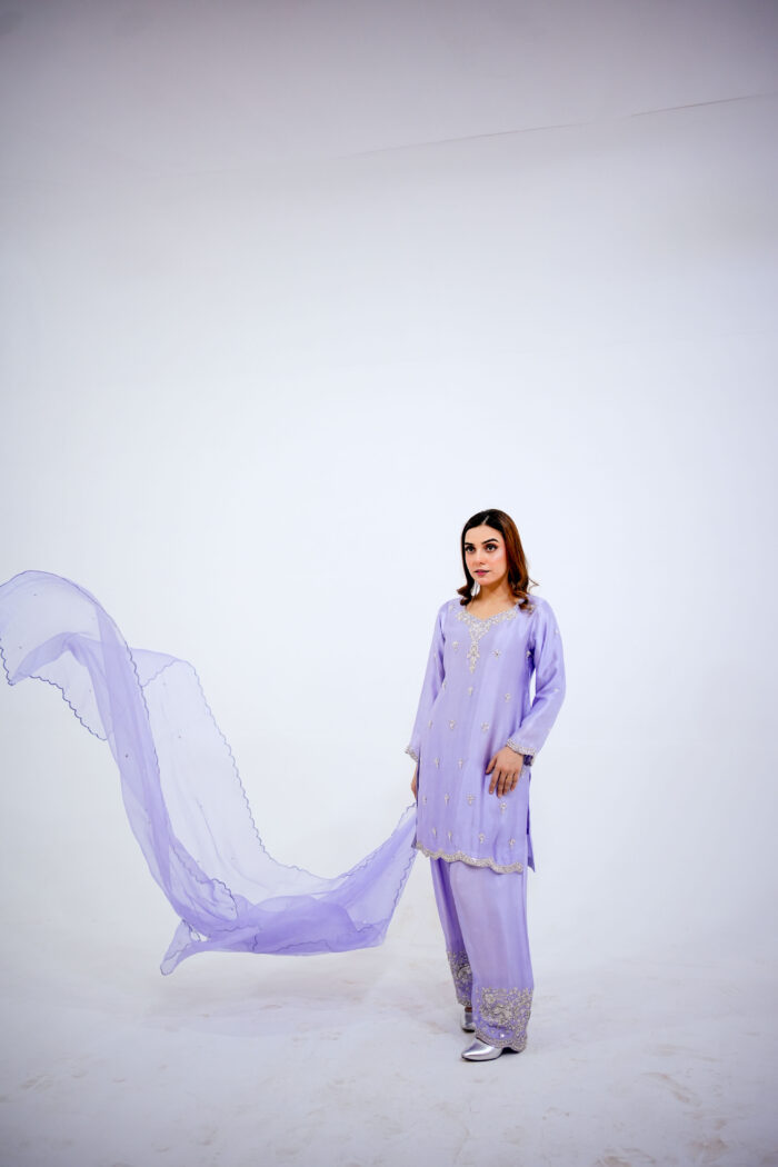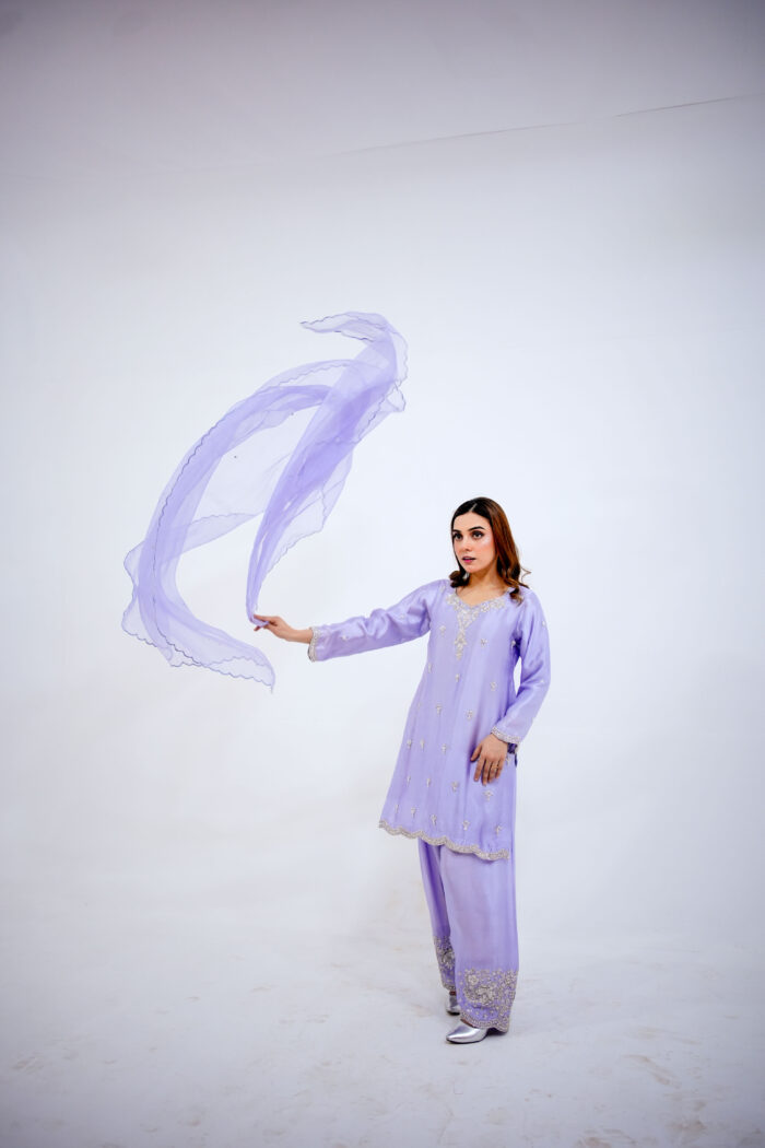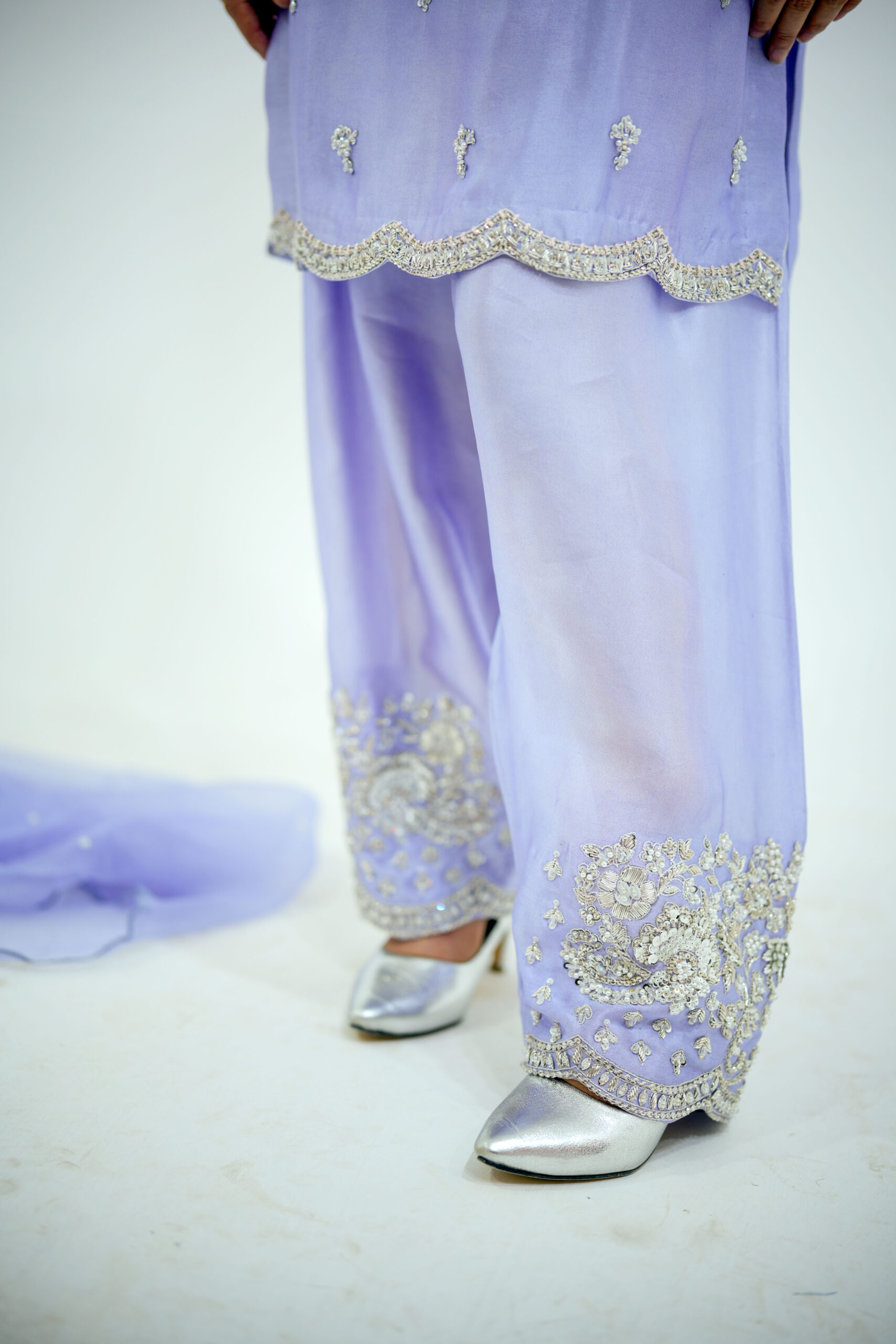 A fusion of Western and eastern mix Farshi Shlwar dress that perfectly blends contemporary fashion with rich traditional craftsmanship. The shirt is crafted from premium tissue silk, featuring intricate hand embellishments of all silver dabka, sequins, stones, work and fine tilla work for a high-end couture finish. It is paired with tailored tissue silk farshi shlwar for a sleek, polished silhouette, having beautiful design of Hand work on pancha and a pure organza scalloped edgings of thread and sequins spray for glory looks and elegance. Expert stitching and detailed artisanal work make this outfit an ideal choice for weddings, festive occasions, and formal wear, offering a timeless and sophisticated statement look.