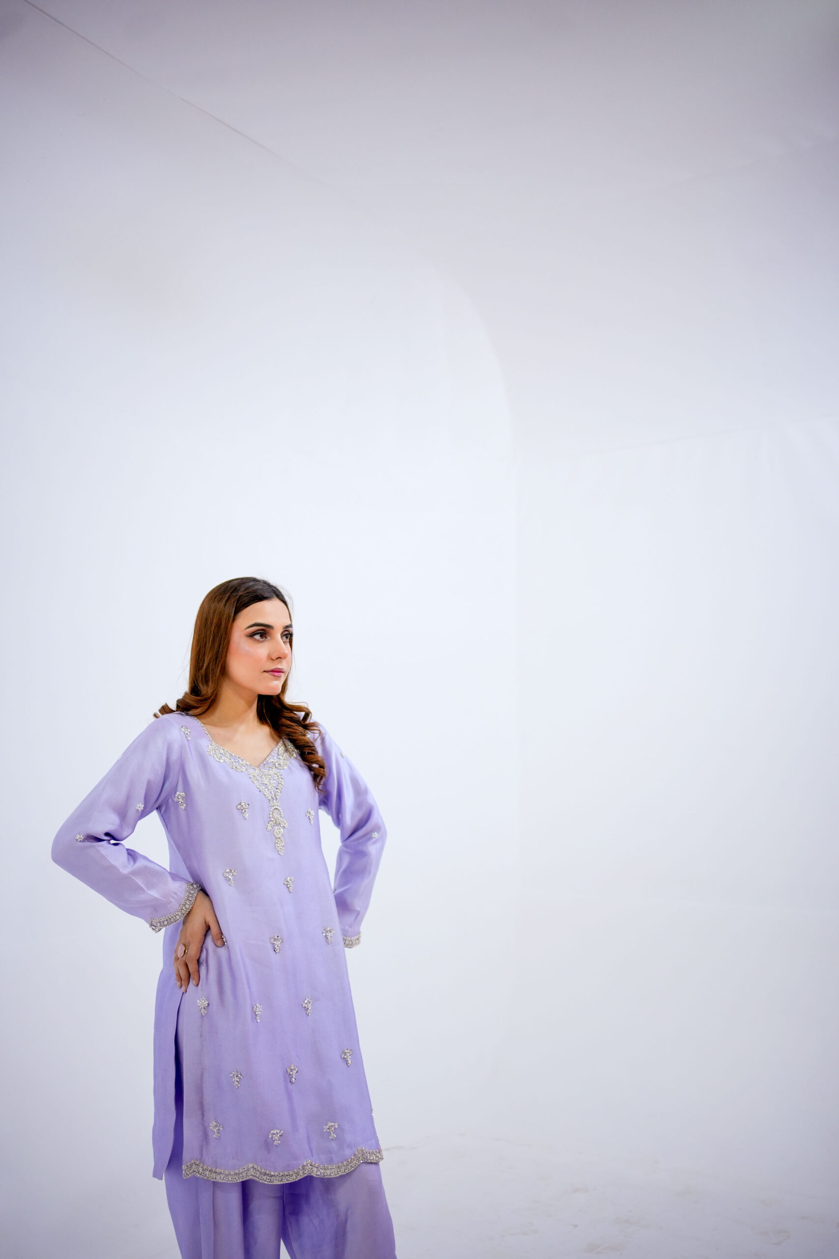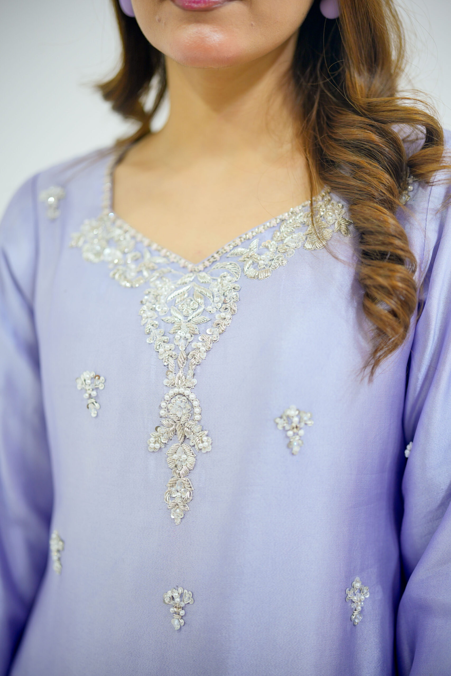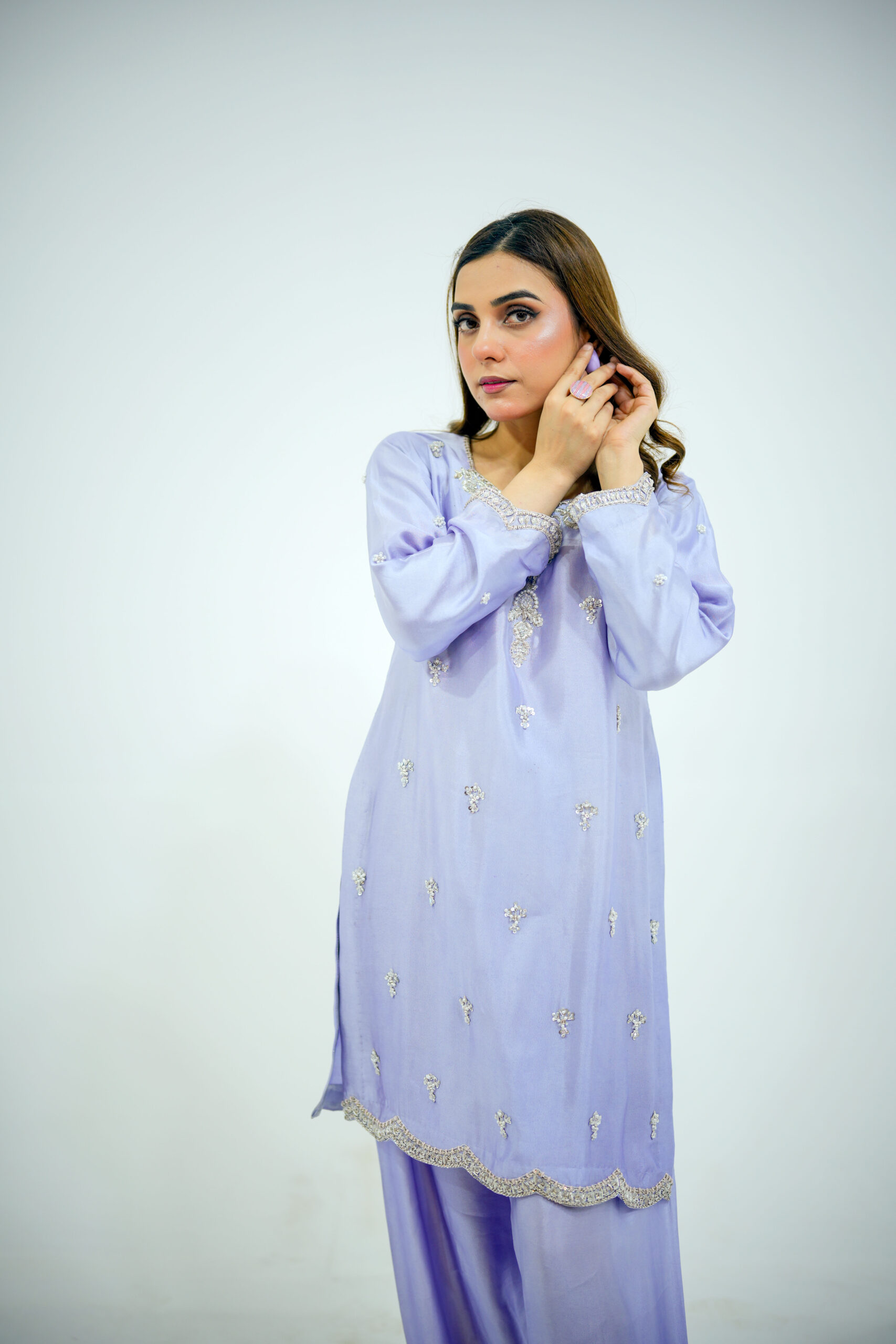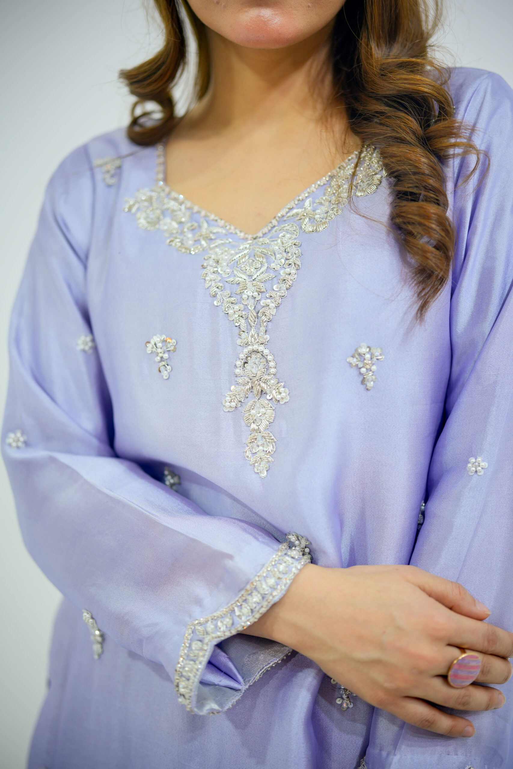 A fusion of Western and eastern mix Farshi Shlwar dress that perfectly blends contemporary fashion with rich traditional craftsmanship. The shirt is crafted from premium tissue silk, featuring intricate hand embellishments of all silver dabka, sequins, stones, work and fine tilla work for a high-end couture finish. It is paired with tailored tissue silk farshi shlwar for a sleek, polished silhouette, having beautiful design of Hand work on pancha and a pure organza scalloped edgings of thread and sequins spray for glory looks and elegance. Expert stitching and detailed artisanal work make this outfit an ideal choice for weddings, festive occasions, and formal wear, offering a timeless and sophisticated statement look.