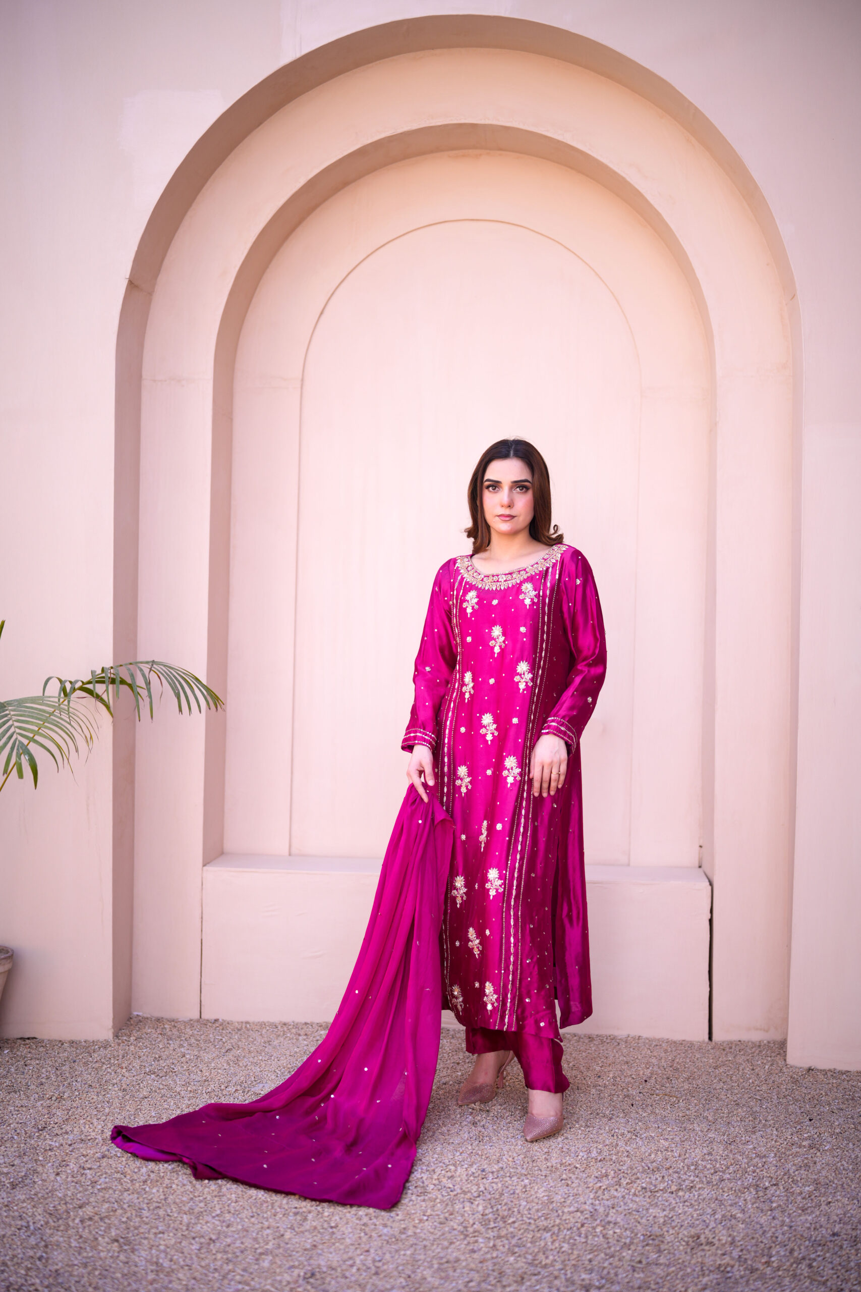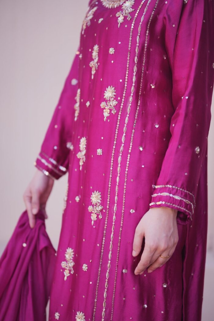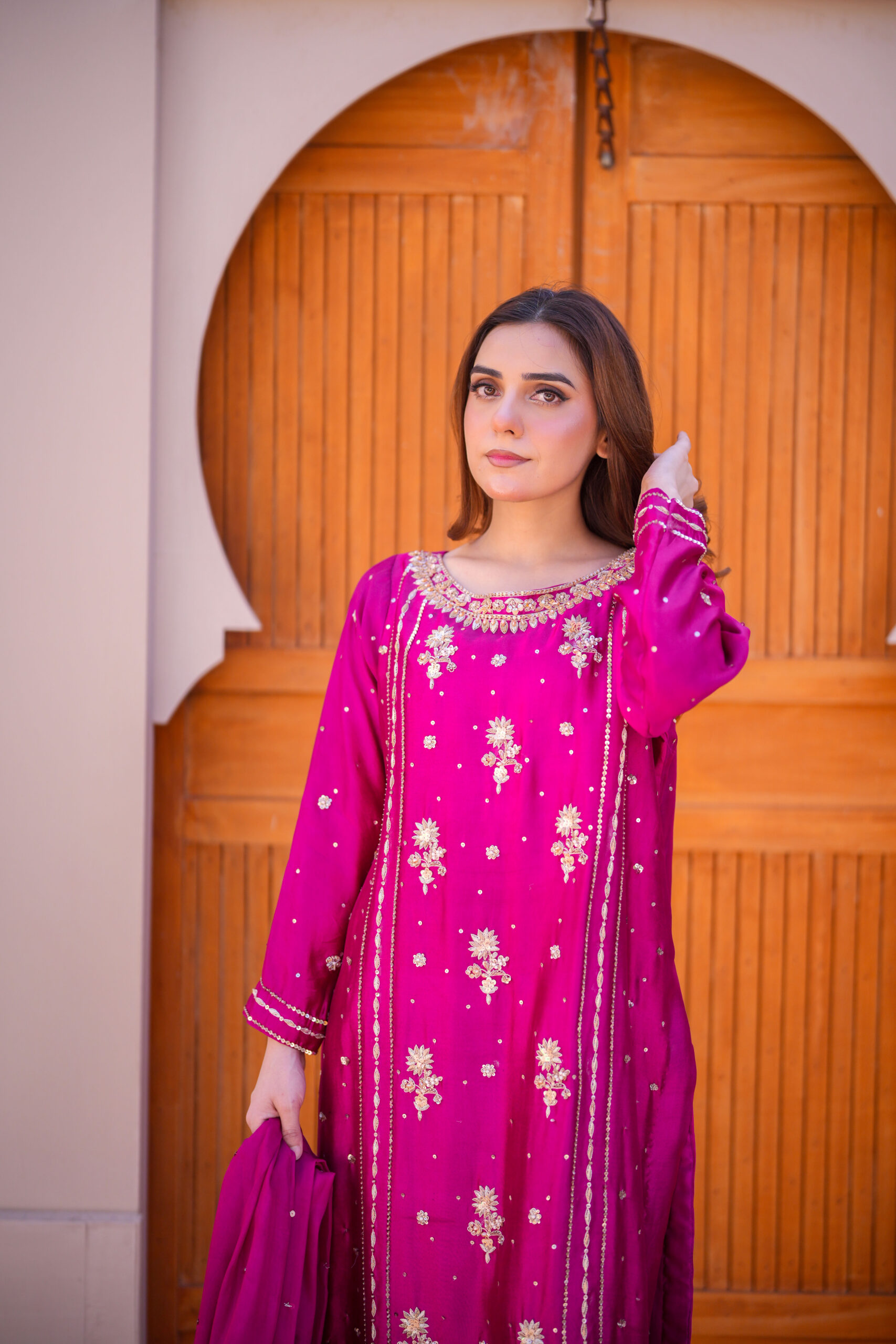 A luxurious formal dress that perfectly blends contemporary fashion with rich traditional craftsmanship. The long shirt is crafted from premium tissue silk, featuring intricate hand embellishments of dabka, sequins, stones, and fine tilla work for a high-end couture finish. It is paired with tailored tissue silk pants for a sleek, polished silhouette, and a silk dupatta enhanced with wide silk patches on the pallu for added elegance. Expert stitching and detailed artisanal work make this outfit an ideal choice for weddings, festive occasions, and formal wear, offering a timeless and sophisticated statement look.