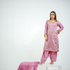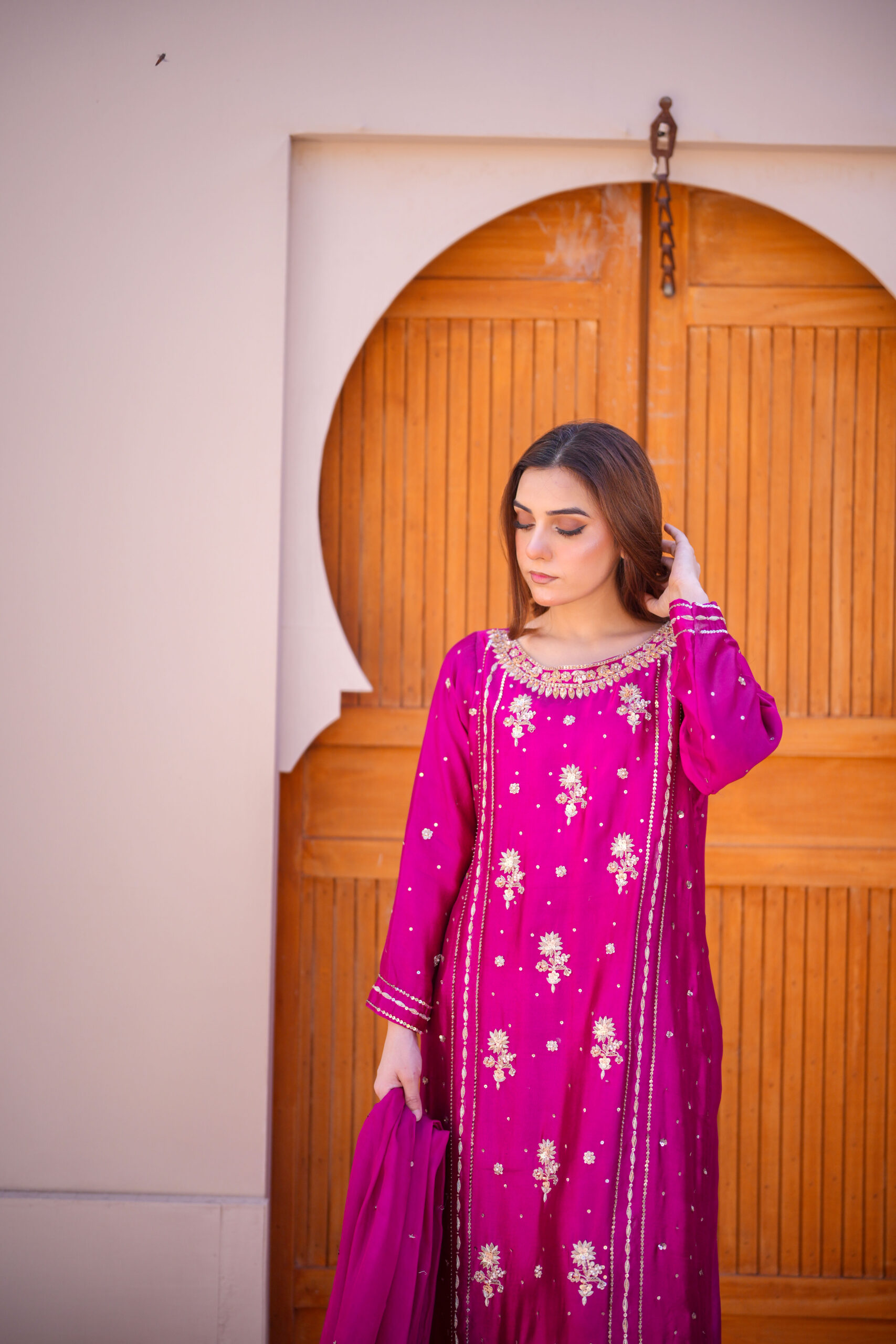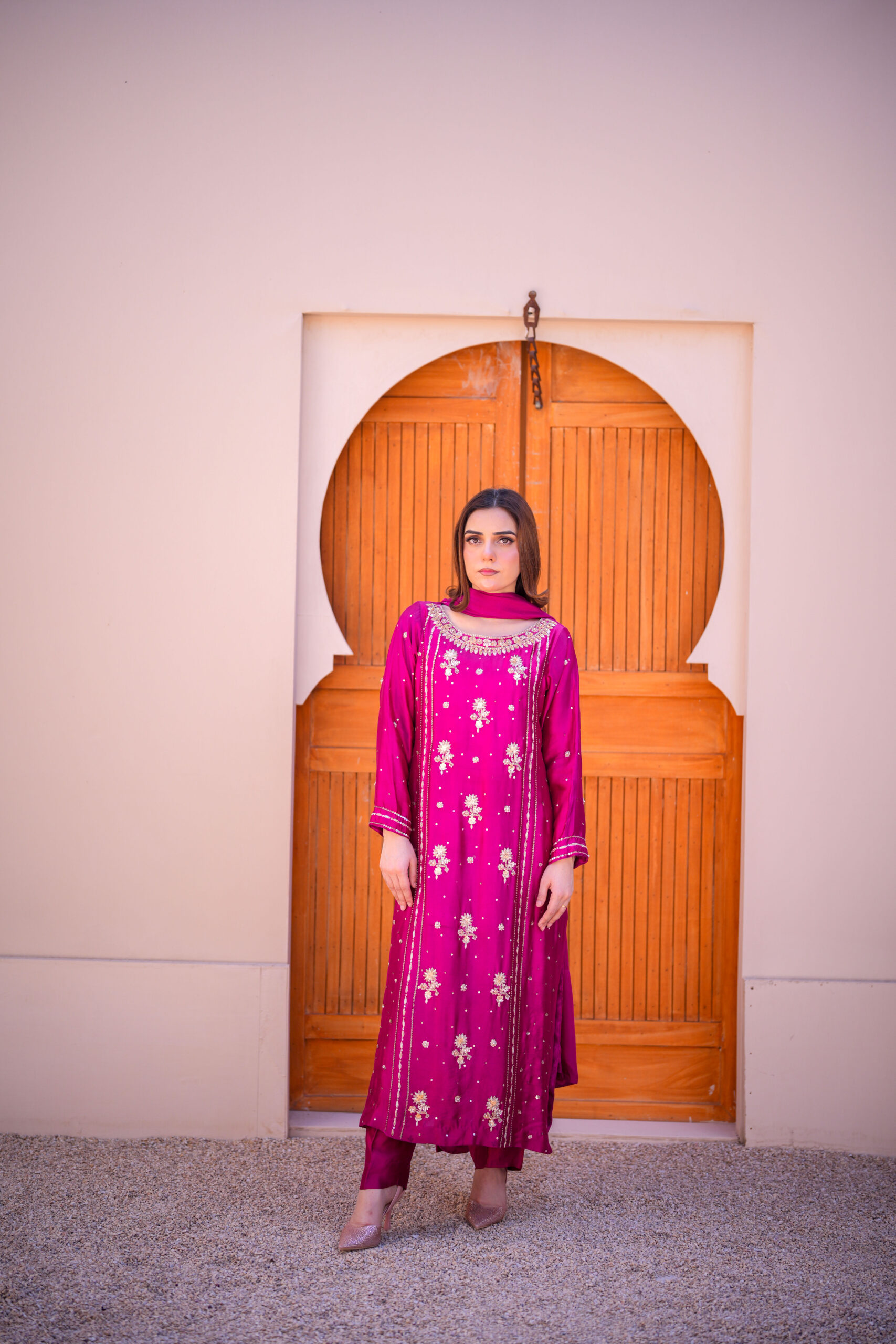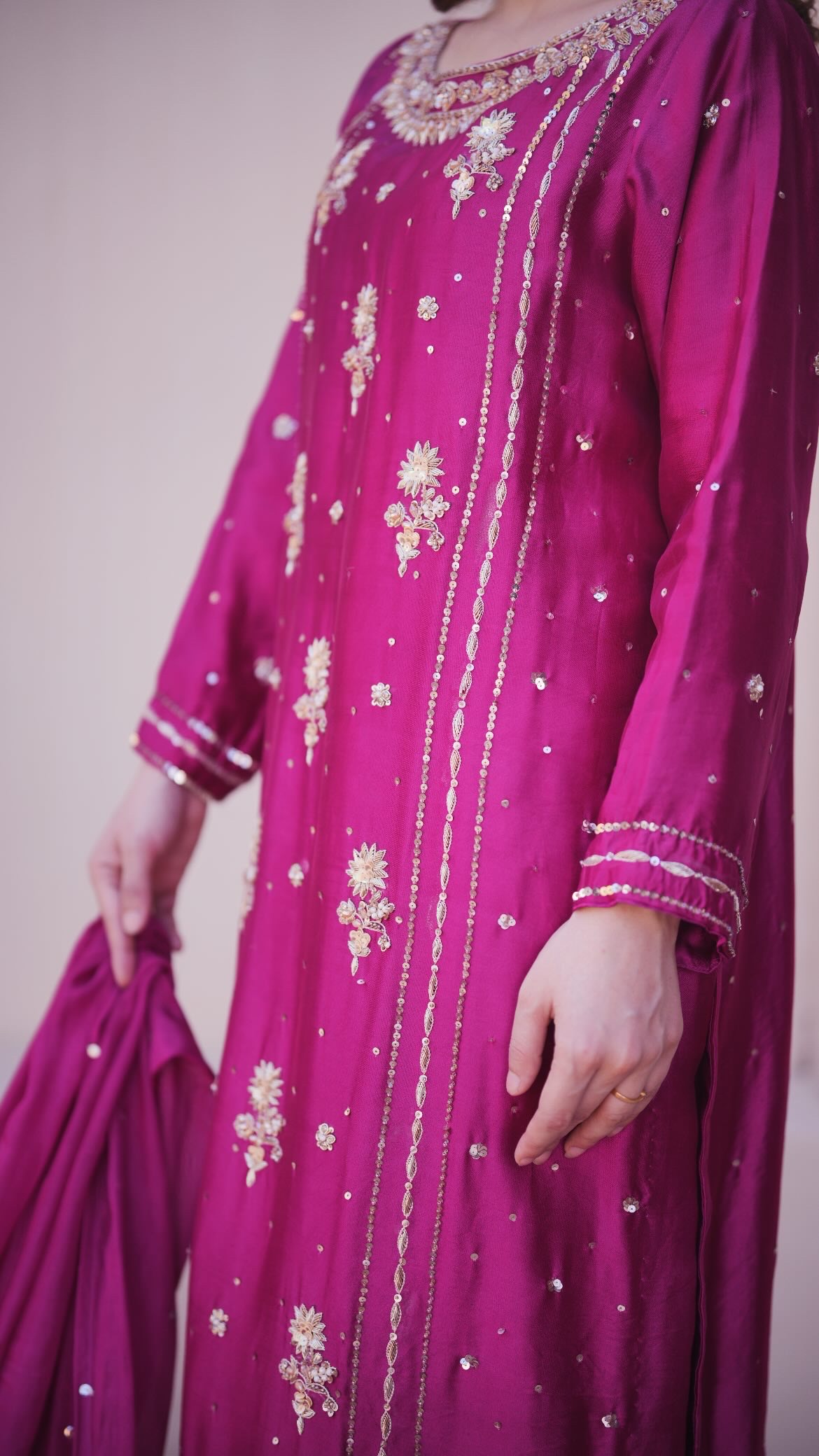 A luxurious formal dress that perfectly blends contemporary fashion with rich traditional craftsmanship. The long shirt is crafted from premium tissue silk, featuring intricate hand embellishments of dabka, sequins, stones, and fine tilla work for a high-end couture finish. It is paired with tailored tissue silk pants for a sleek, polished silhouette, and a silk dupatta enhanced with wide silk patches on the pallu for added elegance. Expert stitching and detailed artisanal work make this outfit an ideal choice for weddings, festive occasions, and formal wear, offering a timeless and sophisticated statement look.